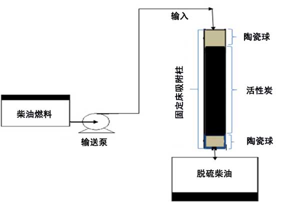 控制排放流量并且固定床吸附塔裝置中的流量保持恒定以達(dá)到穩(wěn)態(tài)條件。在接近穩(wěn)態(tài)條件時從固定床吸附塔裝置出口采集產(chǎn)品樣品并準(zhǔn)備用于硫含量分析。為了確認(rèn)脫硫?qū)嶒灲Y(jié)果的準(zhǔn)確性,每次運行重復(fù)脫硫運行兩次。運行完成后關(guān)閉計量泵,并將所有打開的閥門設(shè)置為關(guān)閉。
