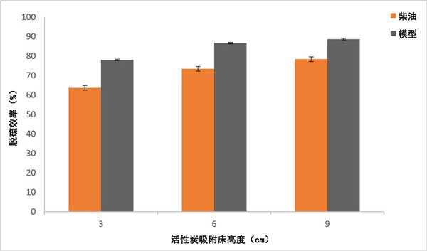 柴油和模型柴油用作油原料,以評估活性炭和改性活性炭的脫硫工藝。柴油初始硫濃度為7510ppm。兩種柴油原料用于固定床吸附塔裝置的脫硫工藝。為了進(jìn)行脫硫?qū)嶒灒褂糜嬃勘脤⒂驮纤腿胨小2捎么怪毕蛳鹿潭ù参剿b置連續(xù)吸附硫化合物,流量為1mLs-1。柱子逐漸裝載不同高度的活性炭層(3-9厘米),對應(yīng)于不同的活性炭重量(10、7和4克)。
